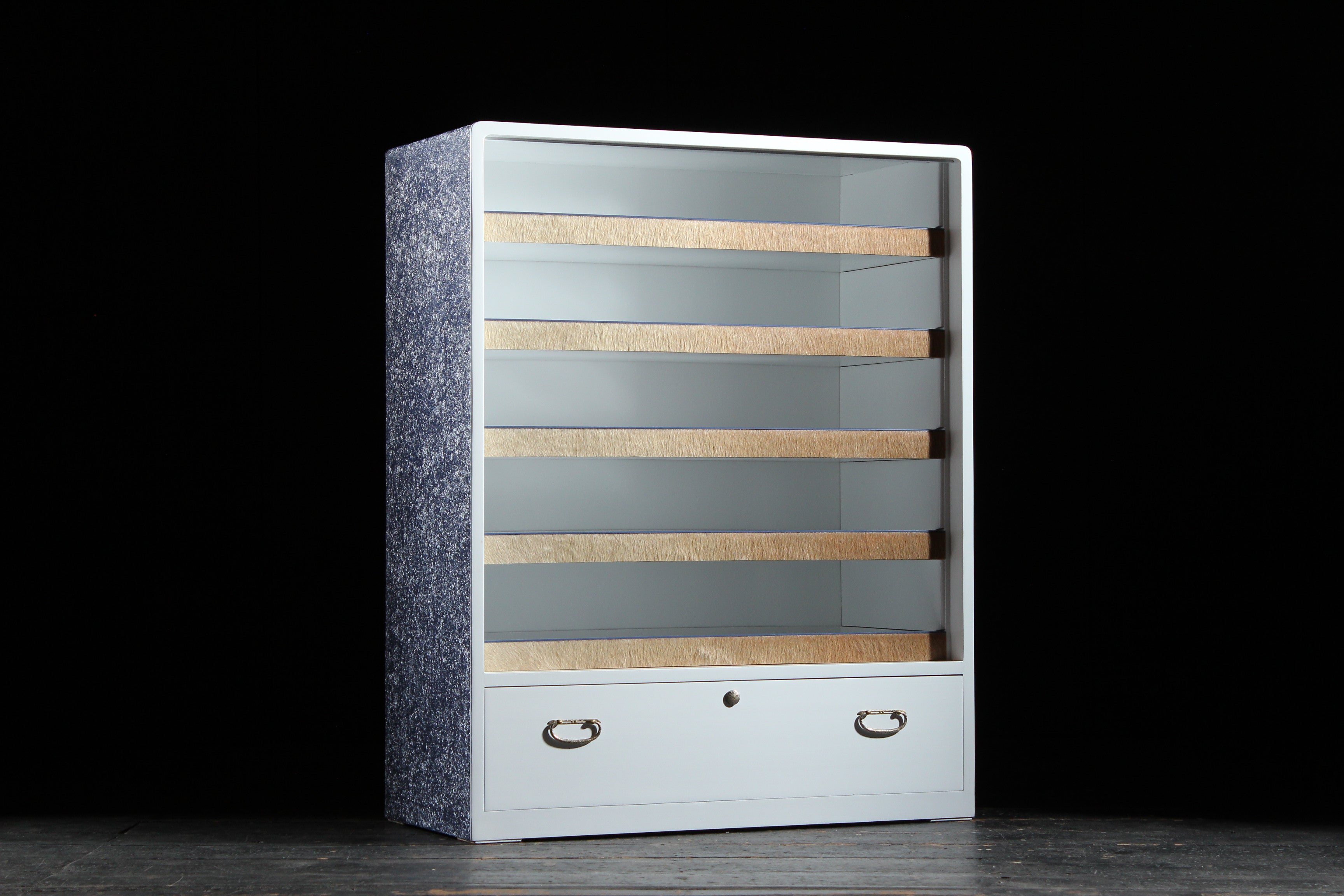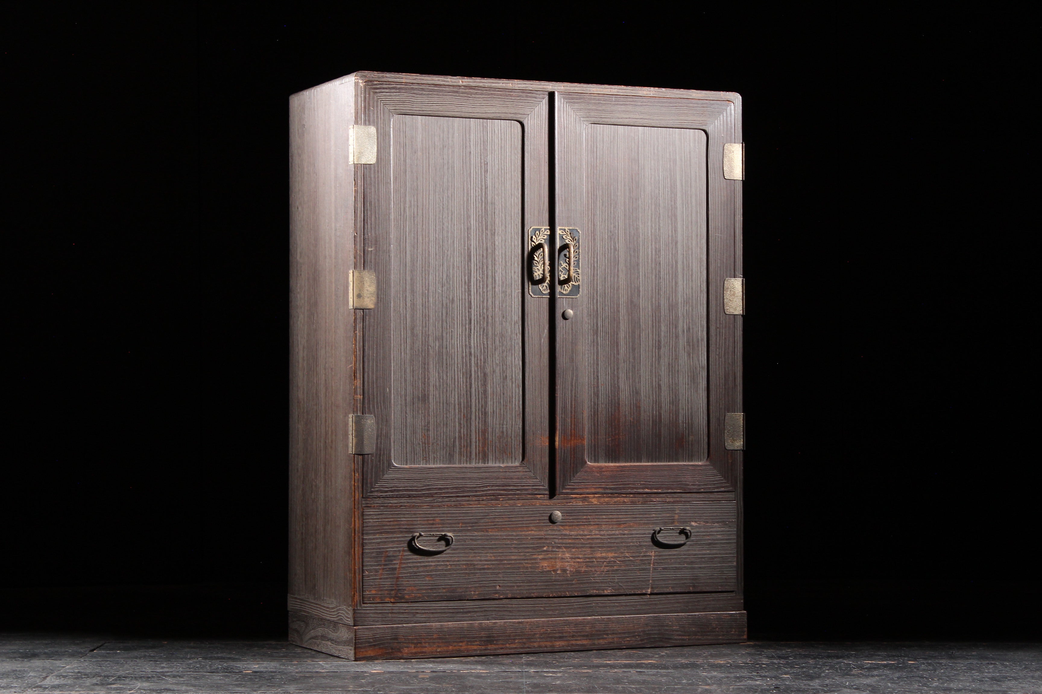 古びた着物箪笥の扉を取り払い、色あせた箪笥を大胆にリメイクした商品です。元々のイメージを一新し、ゴージャスで爽やかなキャビネットに生まれ変わりました。5枚のトレイと引き出しが1杯収納された、使い勝手の良いアイテムです。