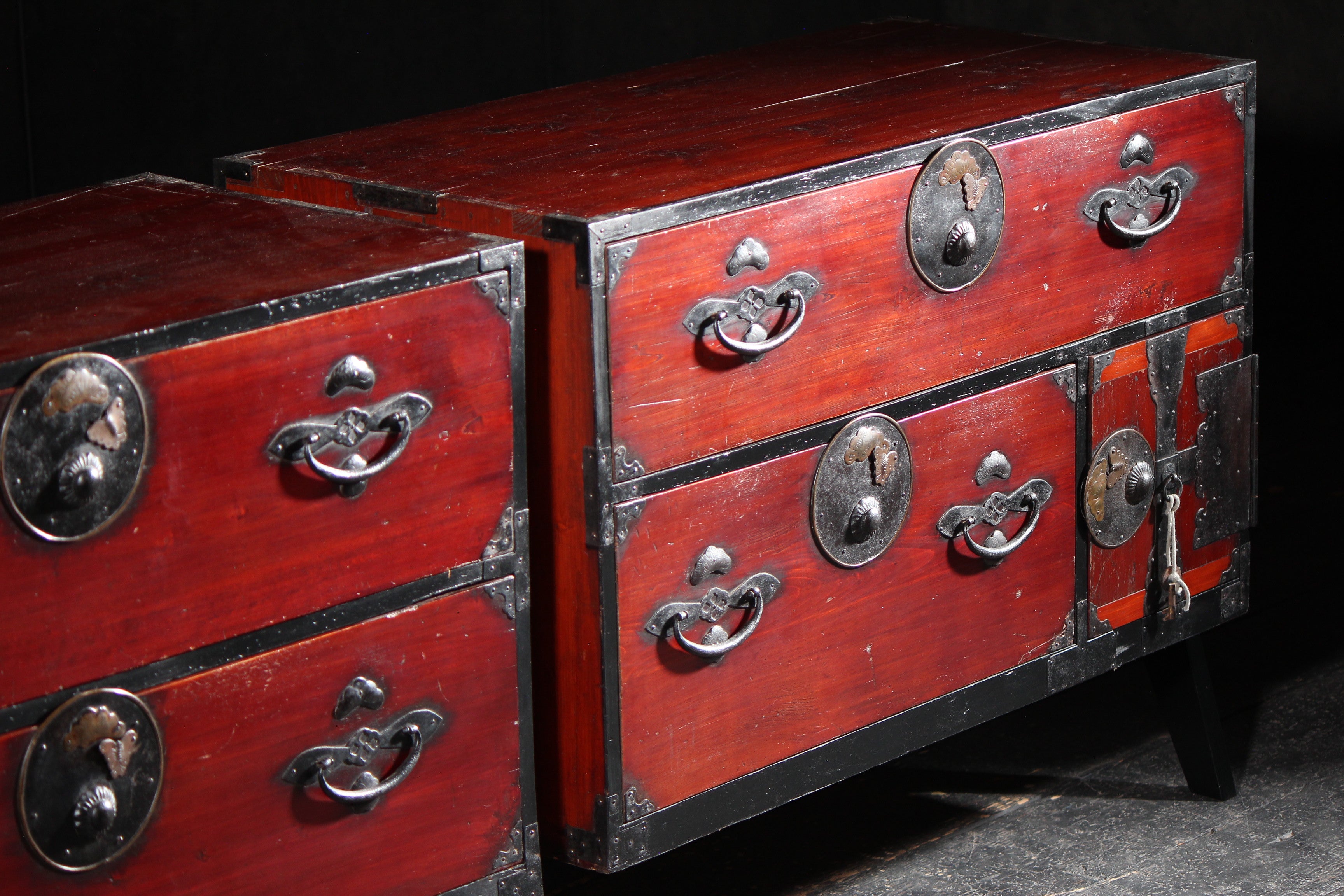 古びた質感と凝った金具が魅力的な二本松箪笥。