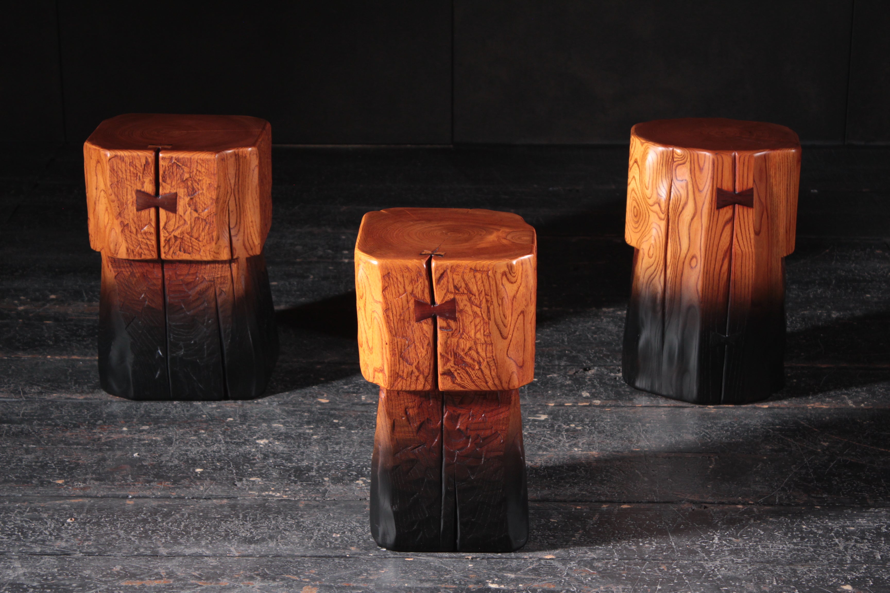 上部はけやきの木目、脚元は黒で、影を吸い上げたような独特な仕上がり。