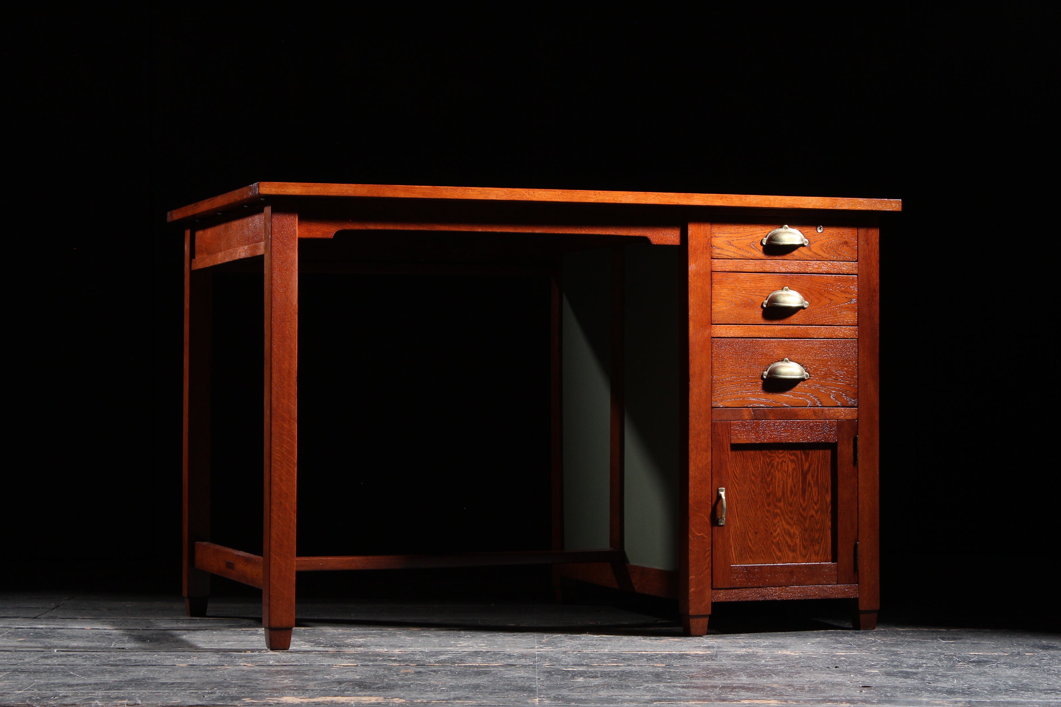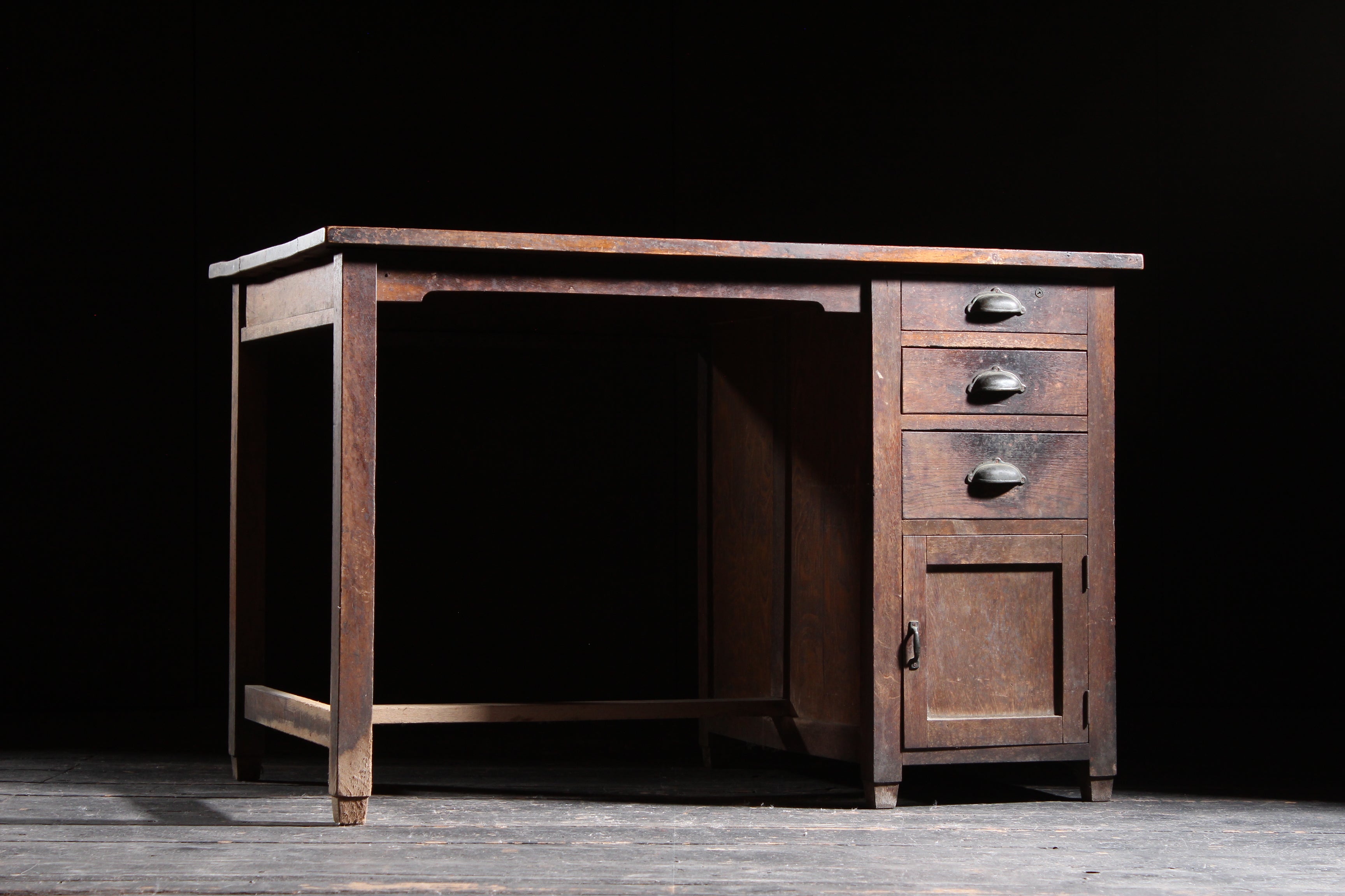 引き出し3杯と開き戸の収納スペースがあり、シンプルで使いやすいデザイン。しっかりとした木目のナラ材と、優しい質感のリノリウム、真鍮の取手でバランスの取れた、美しく安定感のあるデスクです。