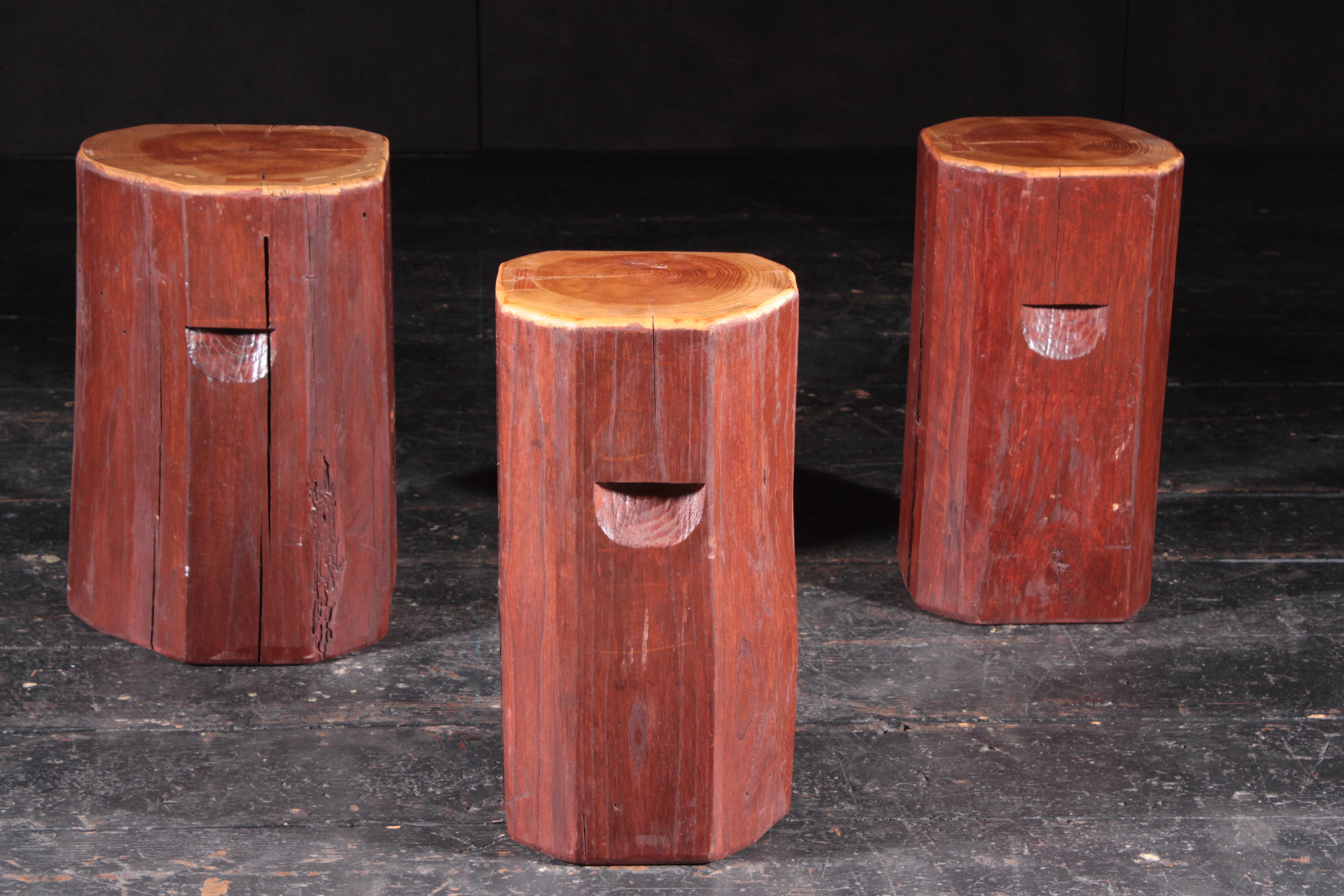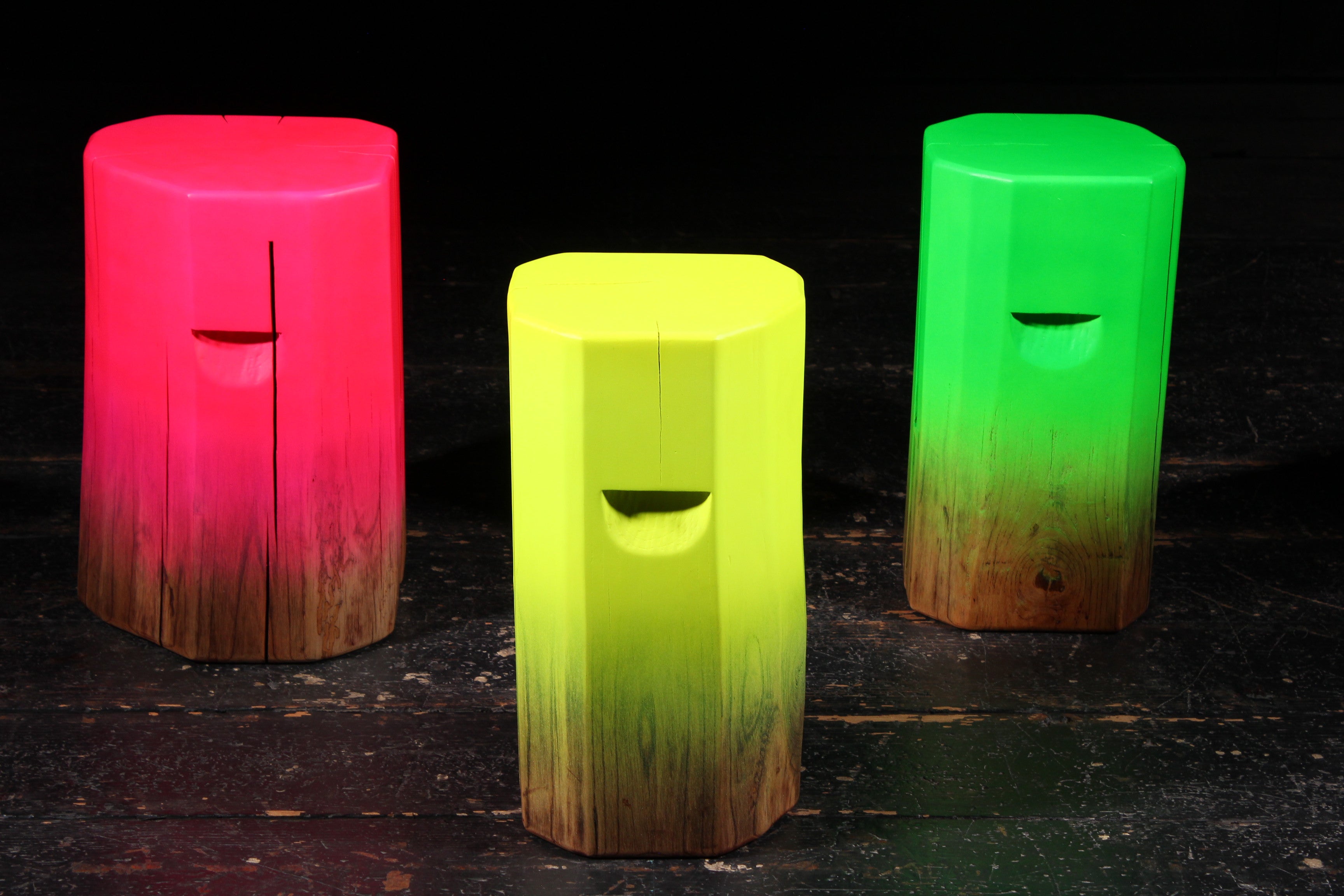 古い丸太のスツールを研磨して表面を整えた後に、蛍光カラーで塗装して仕上げました。