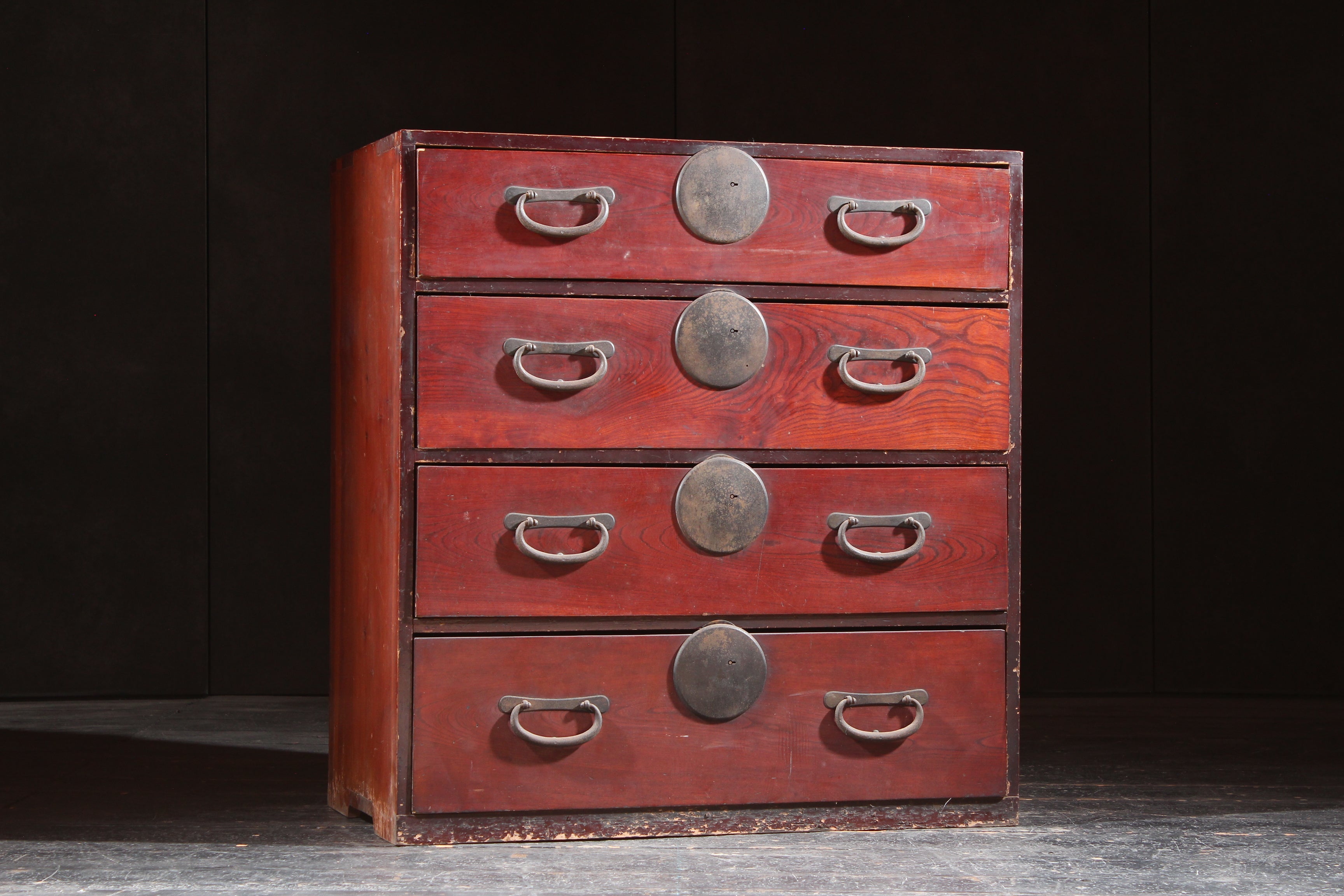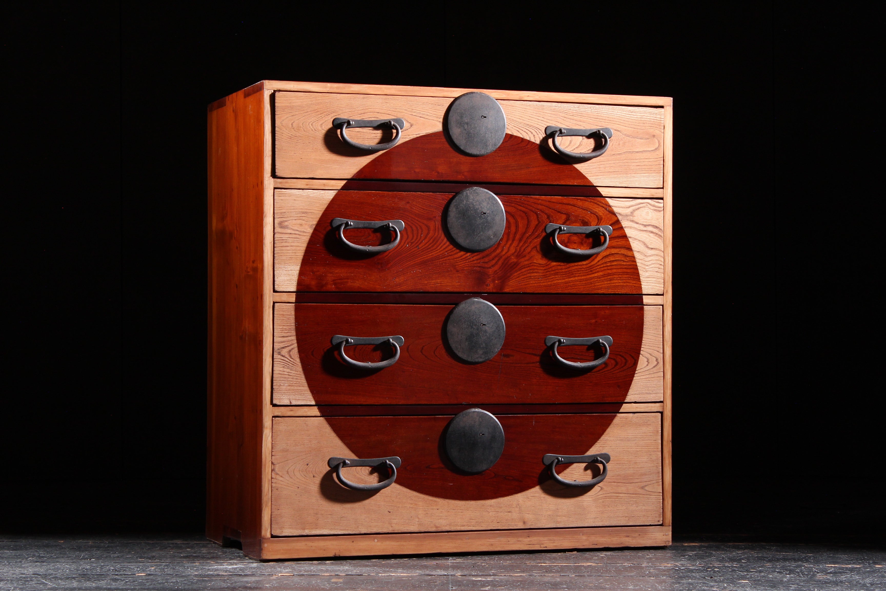 インパクトのある箪笥の顔と、乾いた欅の生地と漆の艶との対比が楽しめる、オリジナルな一棹です。