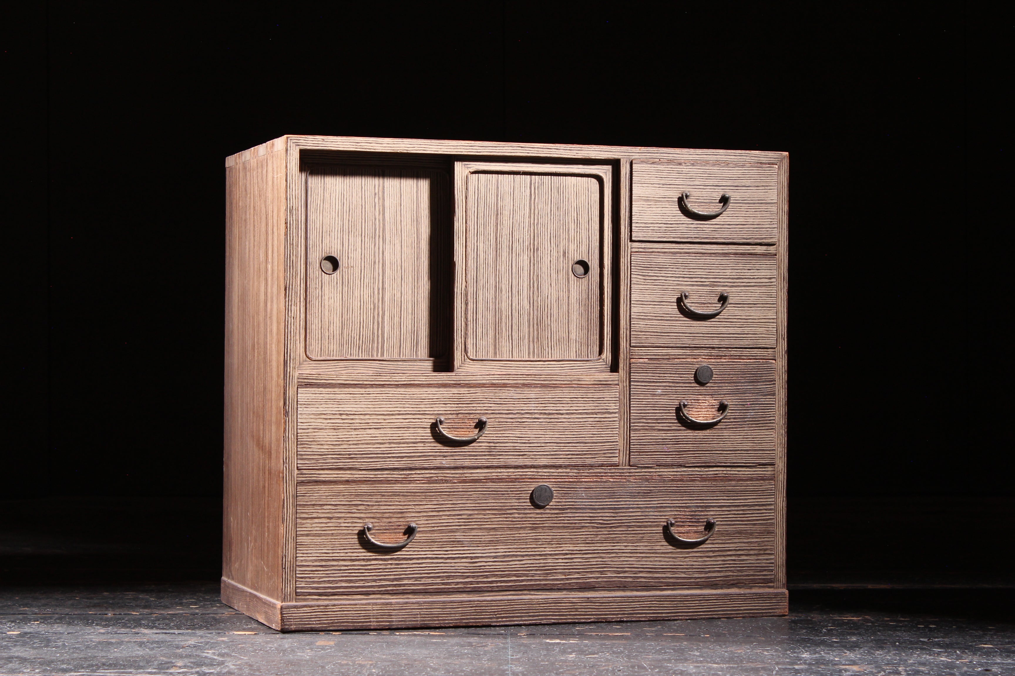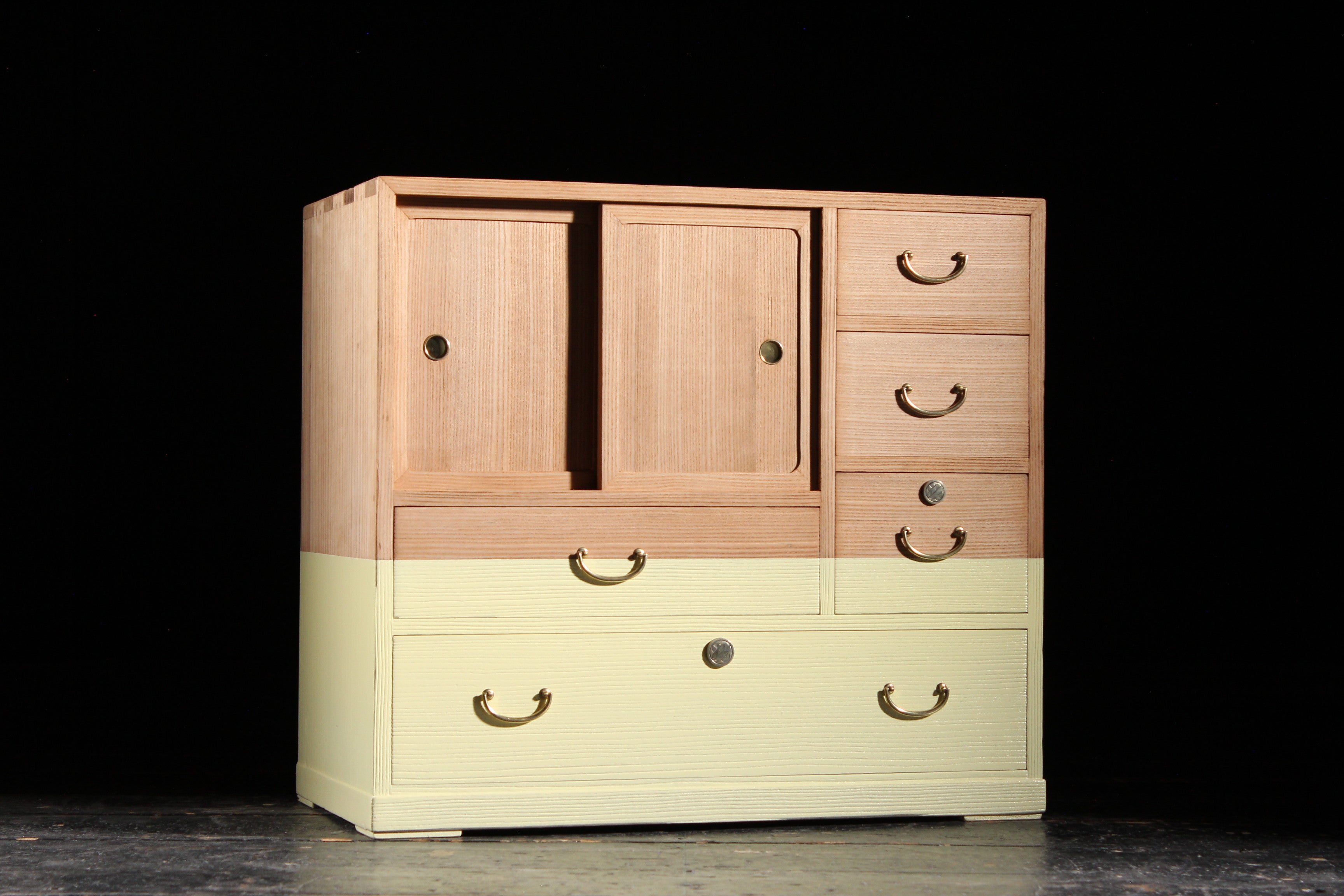 のっぺりとしたアイボリーと枯れた桐材の木目とが同居する、ポップな小箪笥です。