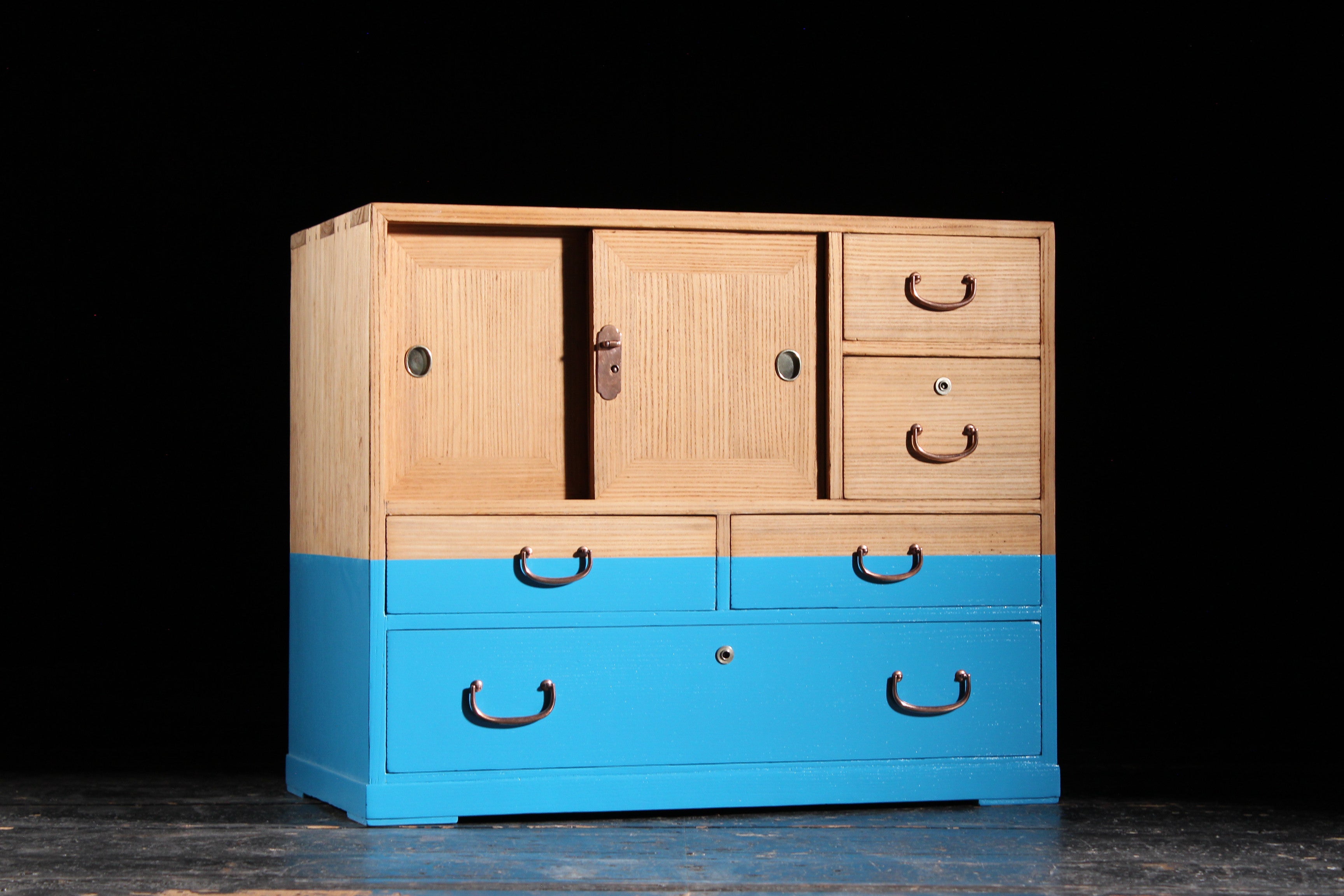 爽やかなブルーと枯れた桐材の木目とが同居する、ポップな小箪笥です。