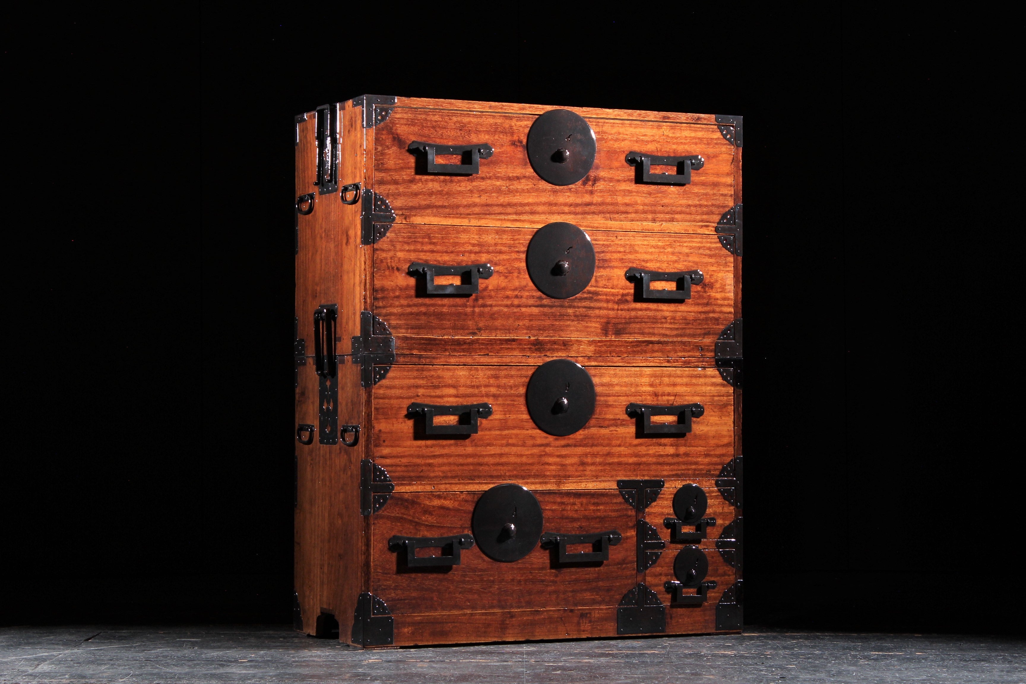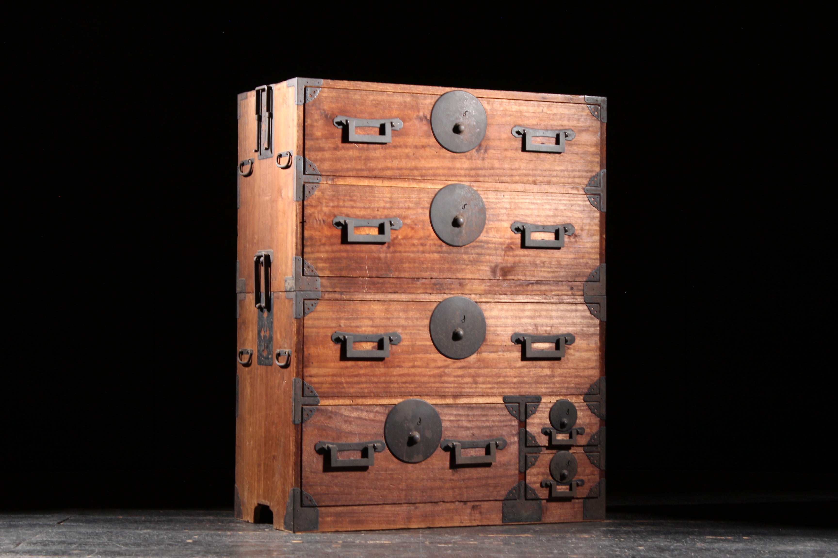 この箪笥がつくられた時から長い年月が経ち、生活の中で意図せずついた傷や汚れ。それらをオリジナルの意匠として活かし、透明な厚みのあるコーティングで閉じ込めています。