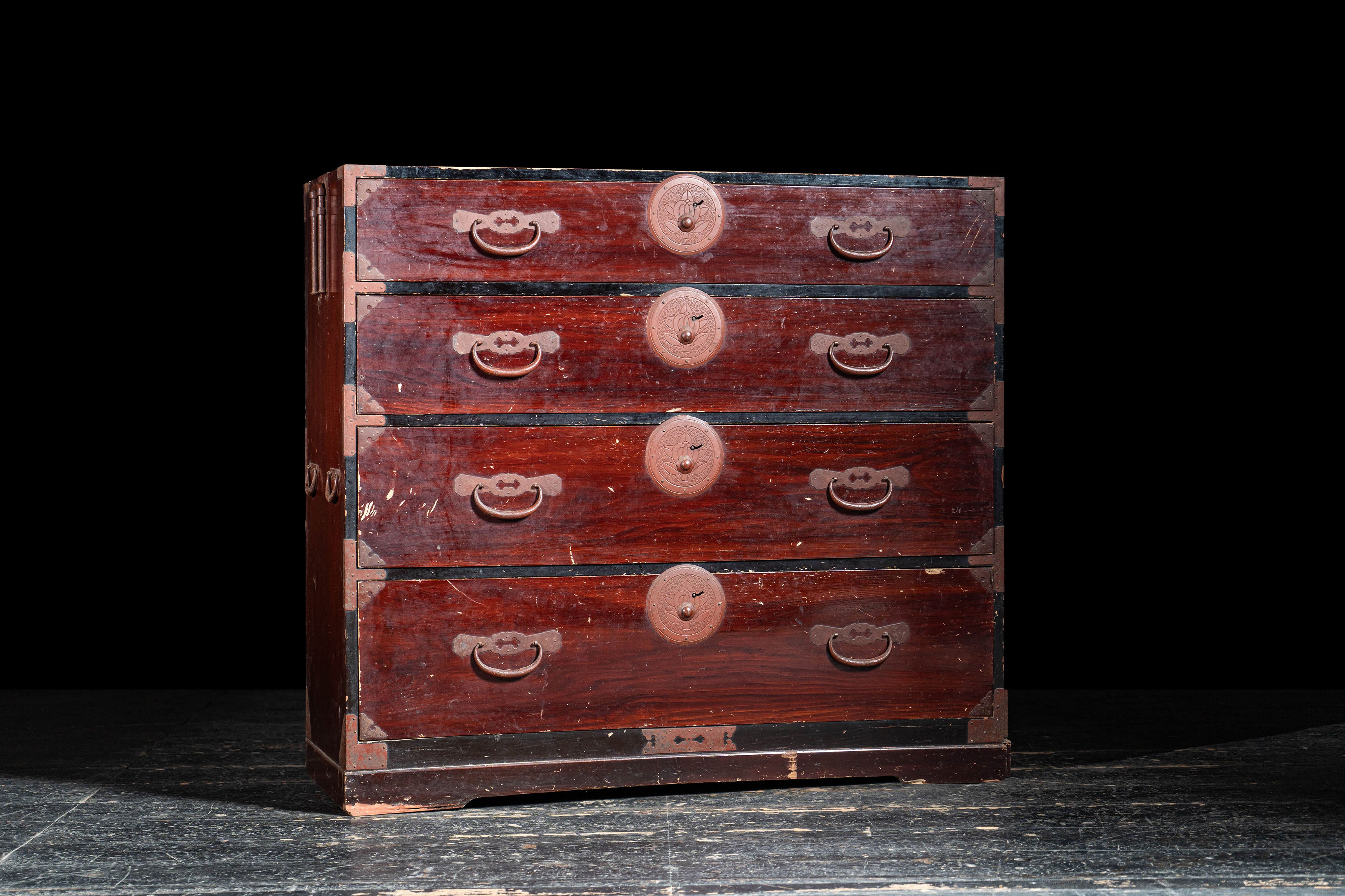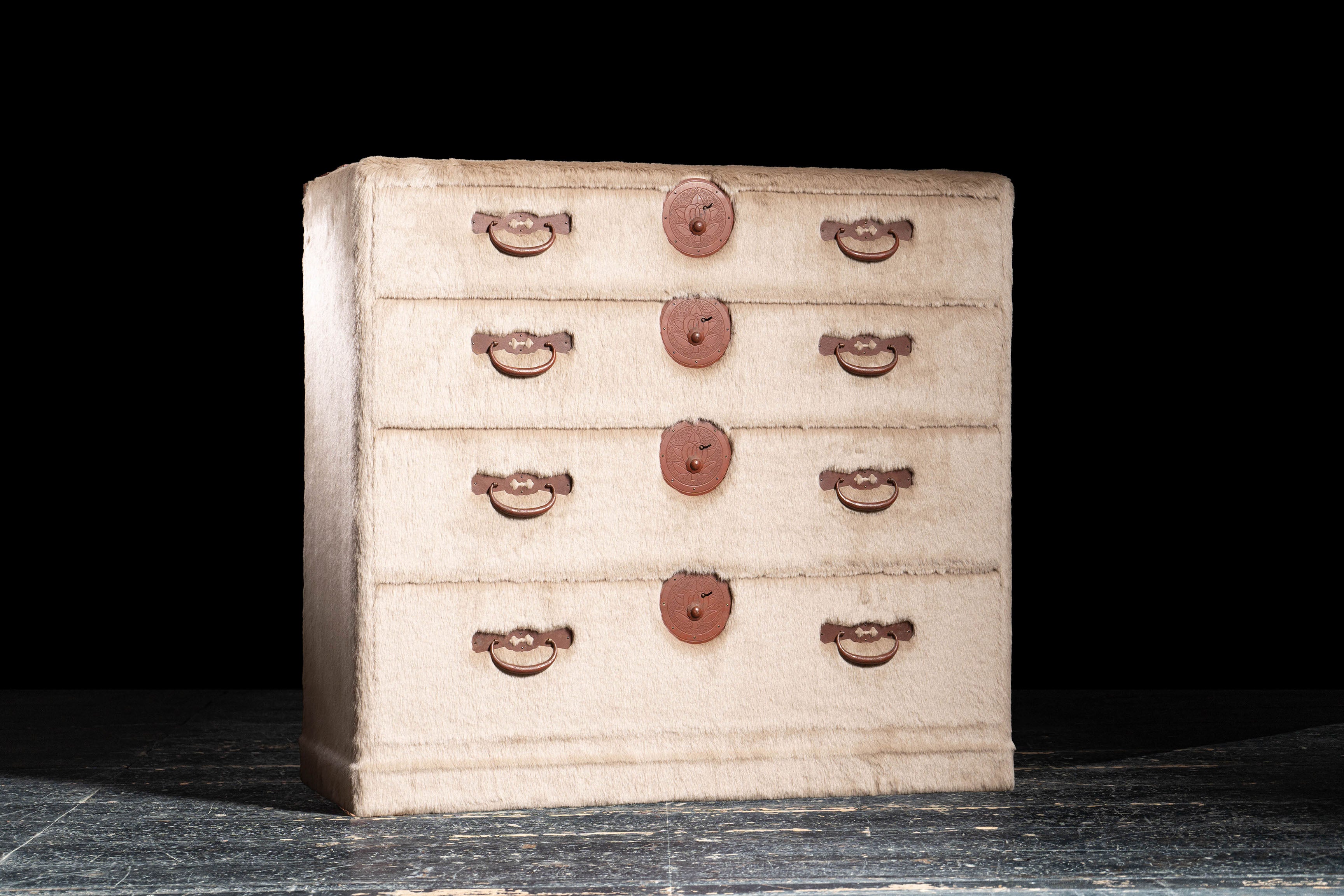 時代箪笥のかたちと特徴的な金物はそのまま活かしています。和家具らしさは残したままで柔らかな毛皮を身にまとい、個性際立つ逸品に仕上がりました。