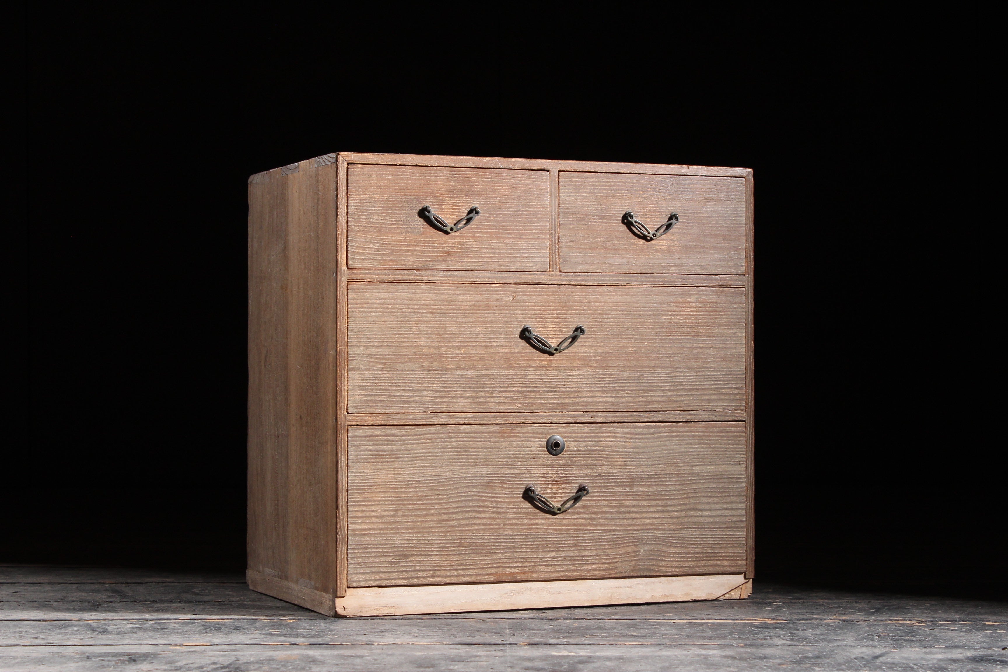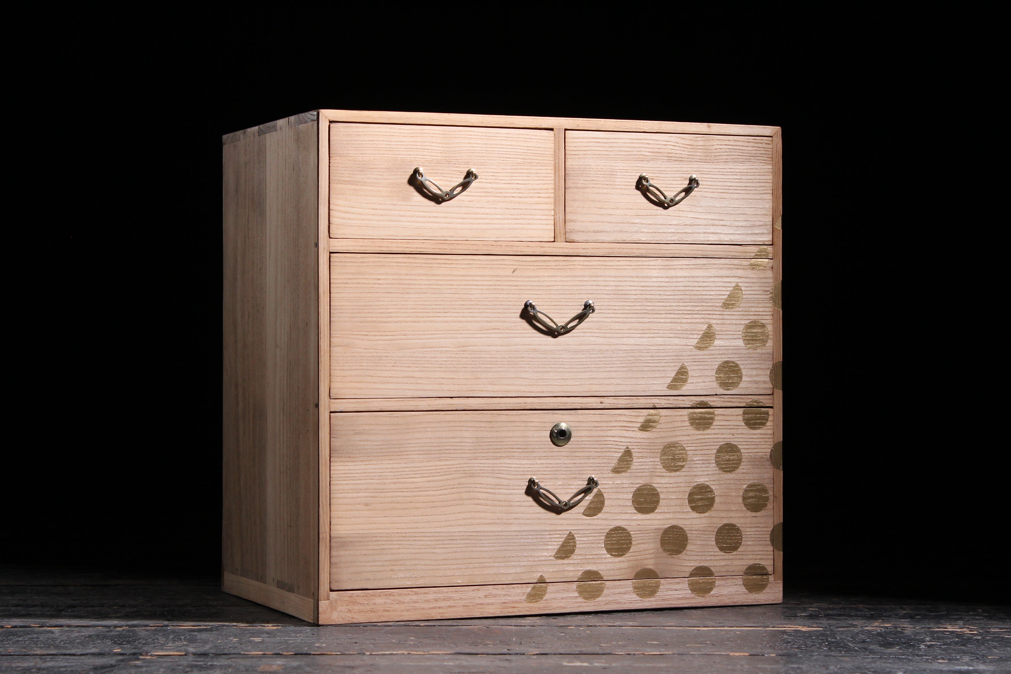 桐材の質感そのままの無塗装で仕上げ、ゴールドの水玉模様をあしらいました。構造の緩みや割れは補修し、引き出しの底板は張り替え、開閉はスムーズにできるよう調整済み。