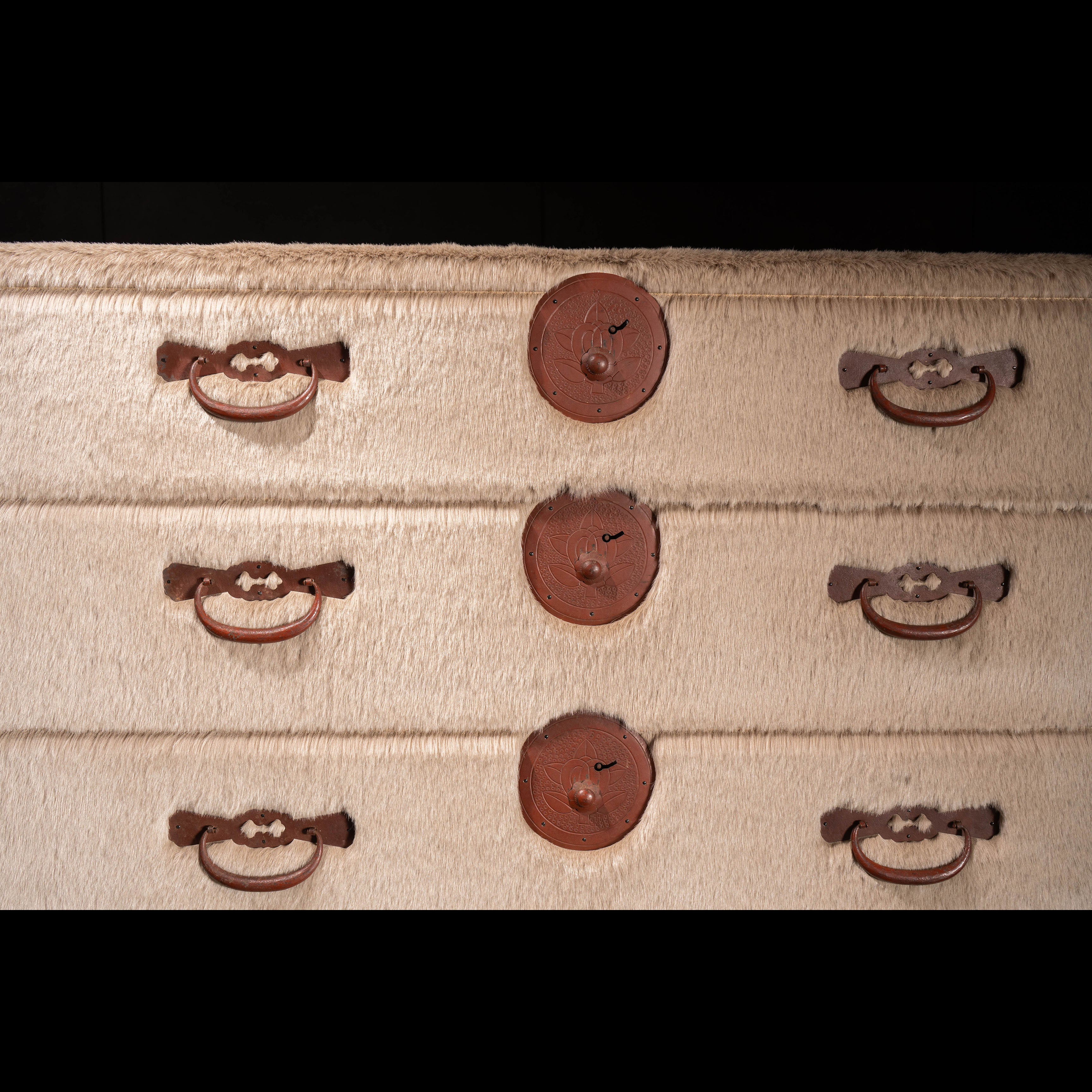 時代箪笥のかたちと特徴的な金物はそのまま活かしています。和家具らしさは残したままで柔らかな毛皮を身にまとい、個性際立つ逸品に仕上がりました。