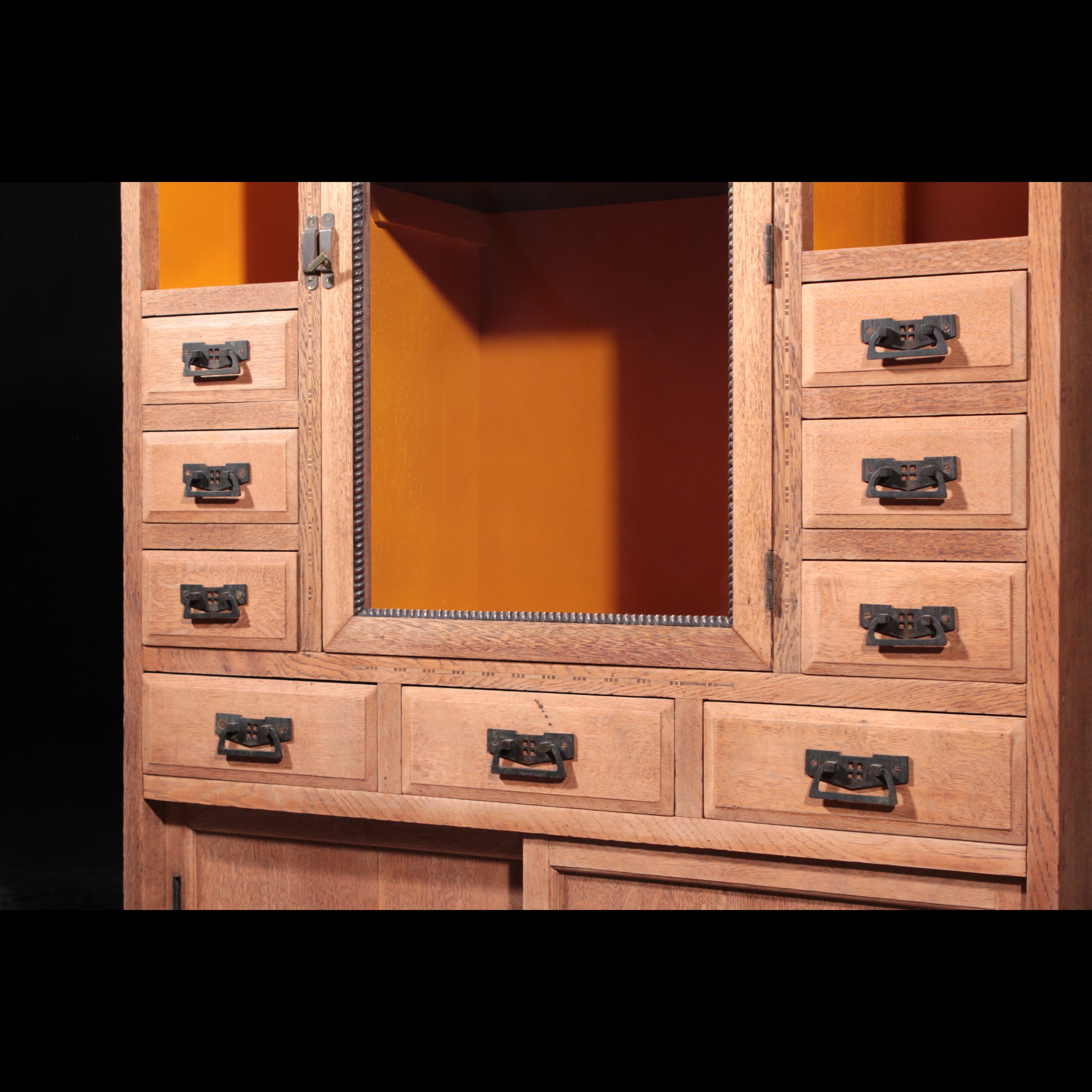 木製のシャッターやその手掛け部分のパーツ、中央の扉周りの象嵌など、細かなところまで丁寧につくられたキャビネットです。