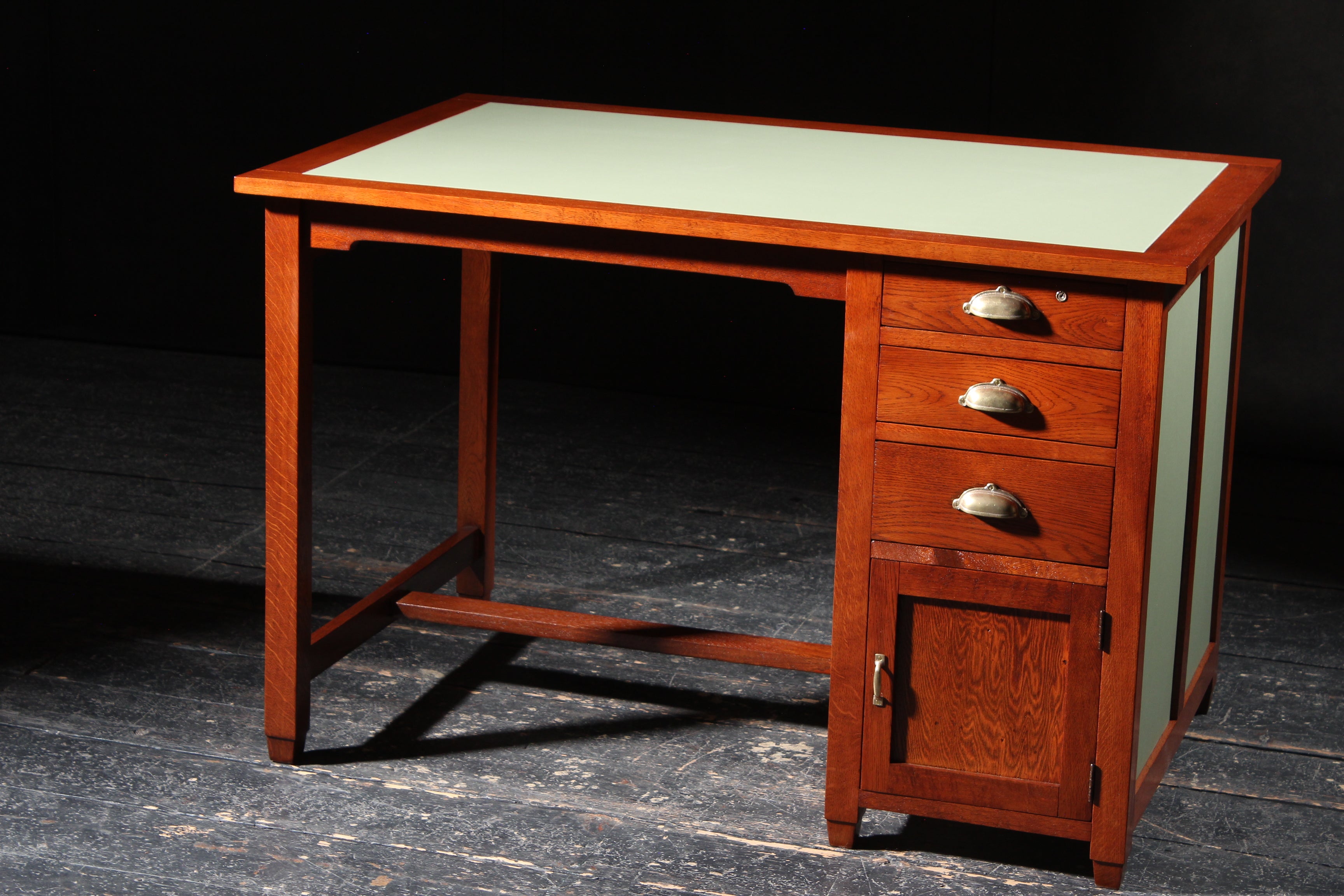 引き出し3杯と開き戸の収納スペースがあり、シンプルで使いやすいデザイン。しっかりとした木目のナラ材と、優しい質感のリノリウム、真鍮の取手でバランスの取れた、美しく安定感のあるデスクです。