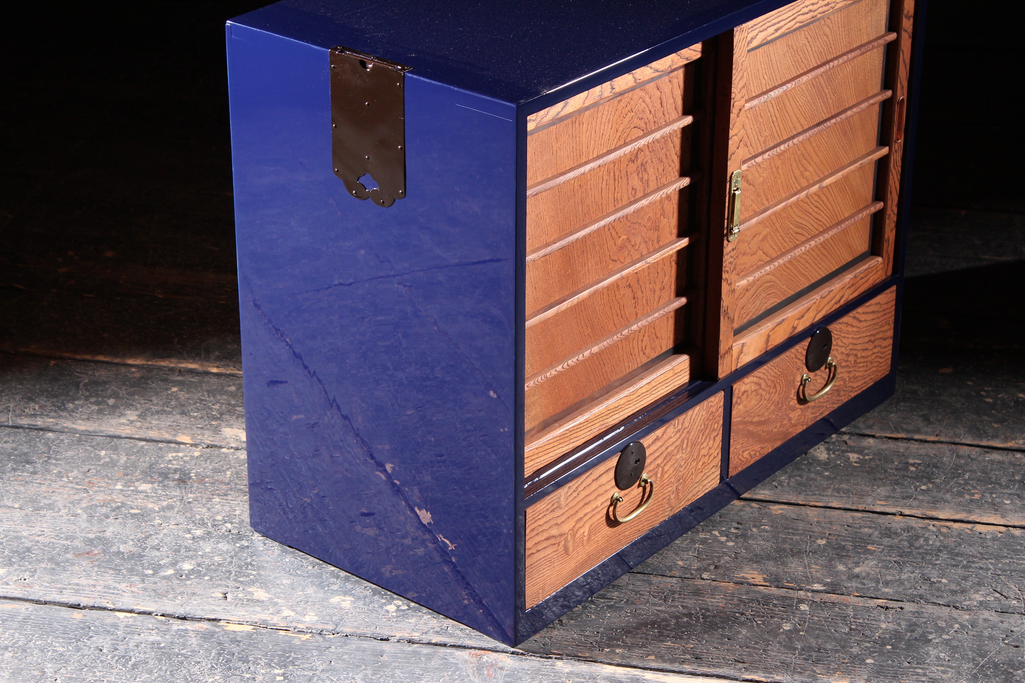 欅の美しく力強い杢目を活かし、本体を深いブルーで仕上げています。
