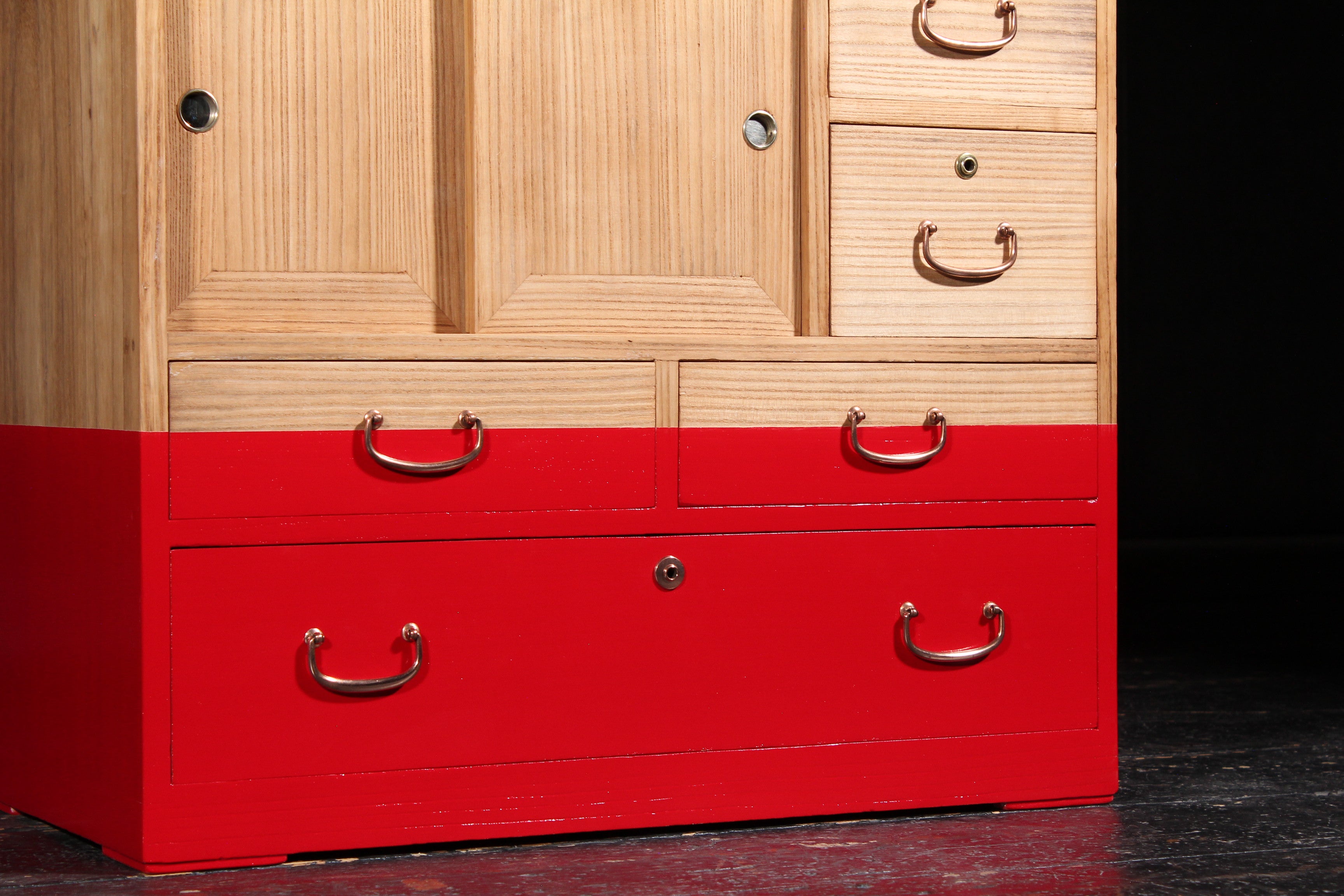 エネルギッシュな赤と枯れた桐材の木目とが同居する、ポップな小箪笥です。