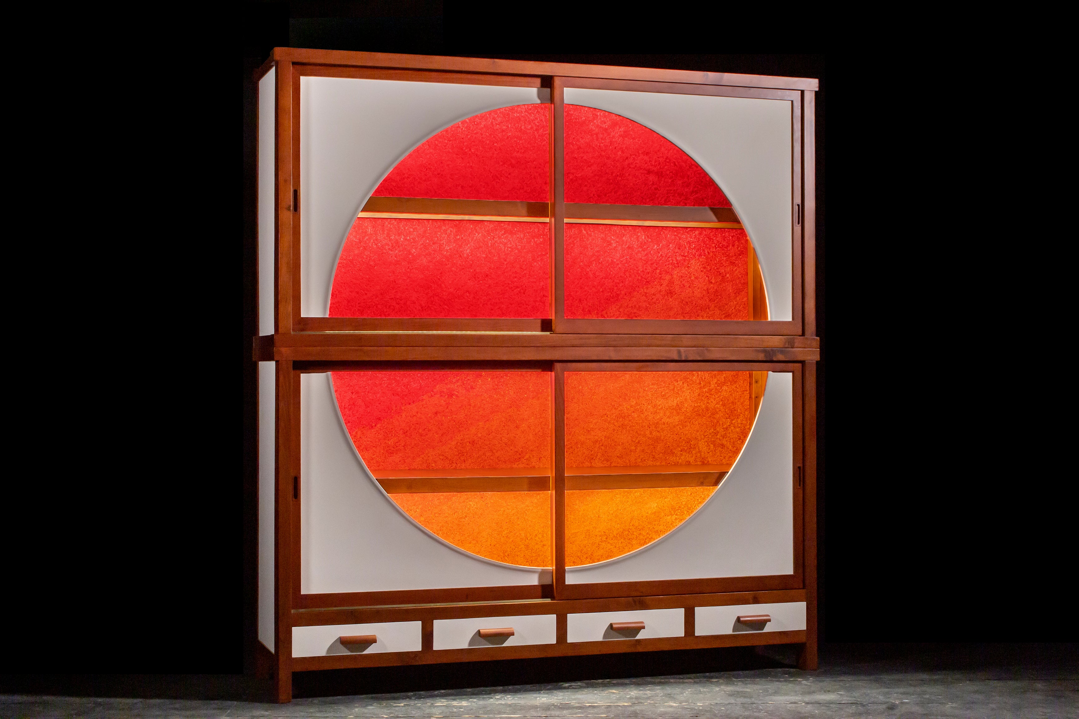 大きな丸窓と真っ赤に輝く紅葉の様な背景を持つ、唯一無二の逸品です。本体は一度分解してフルリペア済み。特徴的なガラスの引戸は新規で作製しているためスムーズに動きます。