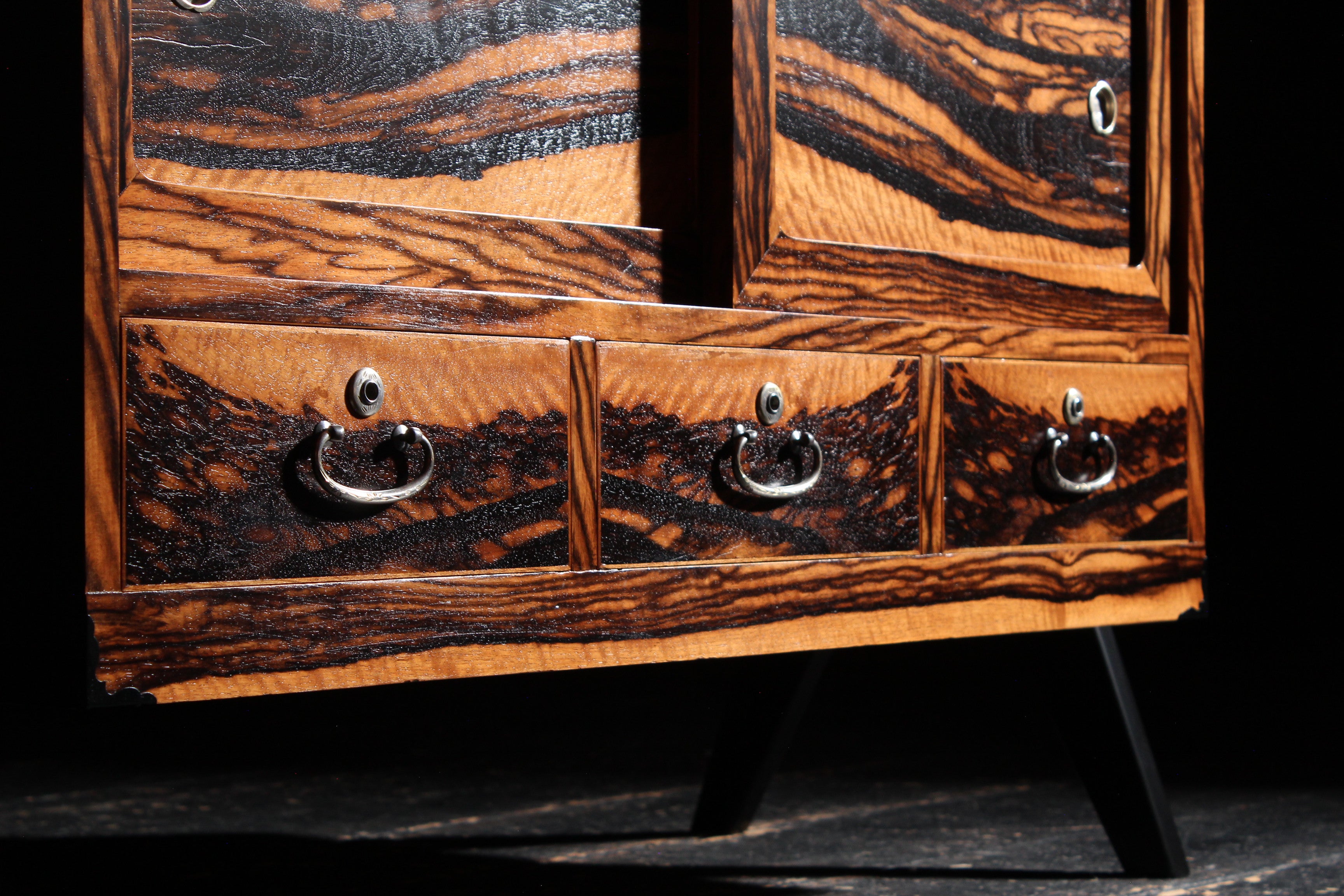 もともとの箪笥らしさは残しながら、現代のインテリアにも取り入れやすいスタイルに仕上げました。黒柿の杢目が美しい、贅沢な逸品です。